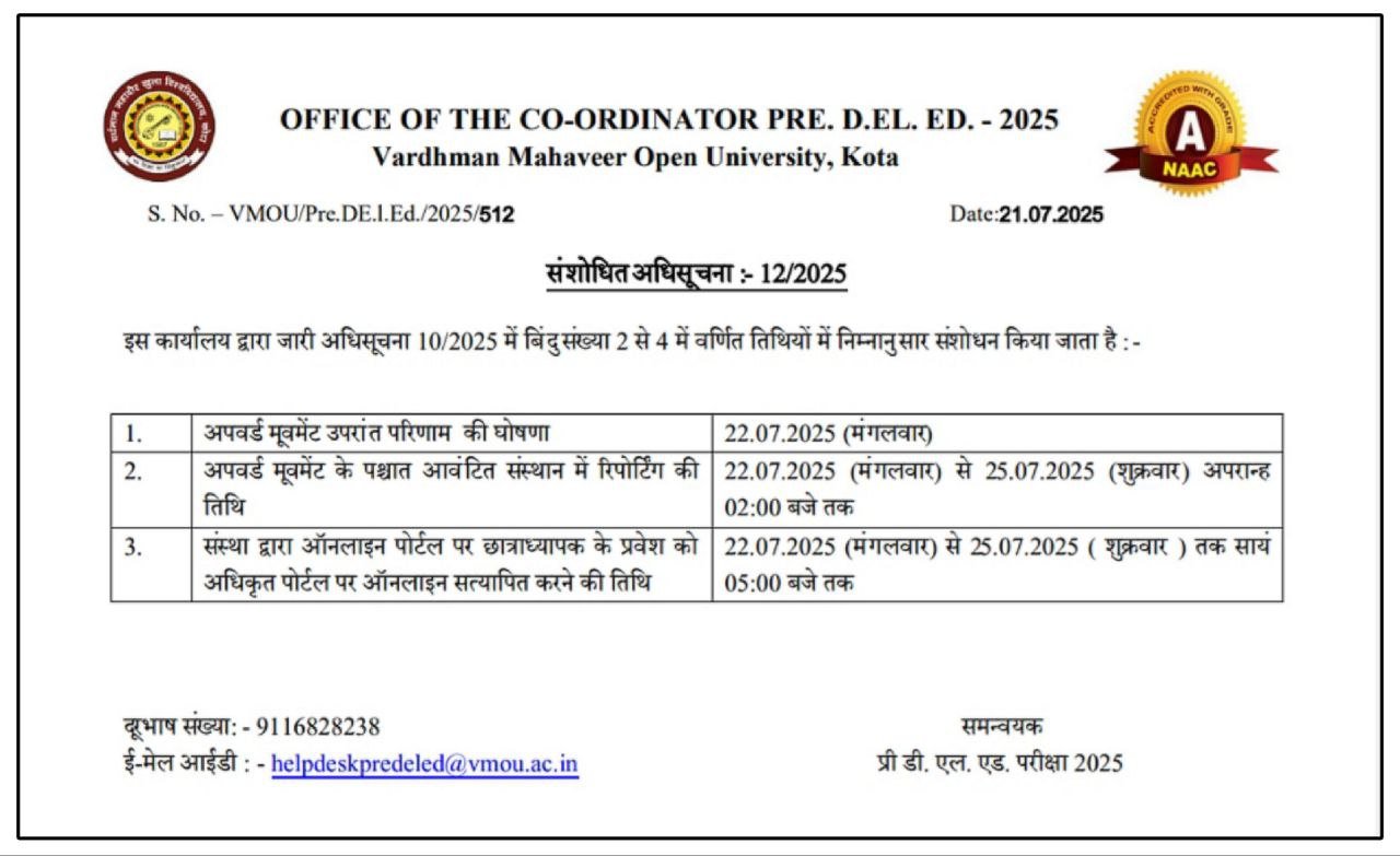 हेलो दोस्तों आज हम राजस्थान बीएसटीसी अपवर्ड मूवमेंट रिजल्ट के बारे में बताएंगे आपको बता दे की वर्धमान महावीर ओपन यूनिवर्सिटी (VMOU), कोटा द्वारा राजस्थान प्री-डीएलएड अपवर्ड मूवमेंट रिजल्ट 10 अगस्त 2025 को जारी की जाएगी शिक्षा संस्थान द्वारा डॉक्यूमेंट वेरिफिकेशन के बाद अभ्यर्थियों को 27 जून से 04 जुलाई 2025 तक स्वयं पोर्टल पर लॉगिन कर Provisional Slip प्राप्त करनी होगी, इसके बाद 03 जुलाई 2025 से बीएसटीसी की कक्षाएं शुरू हो जाएगी